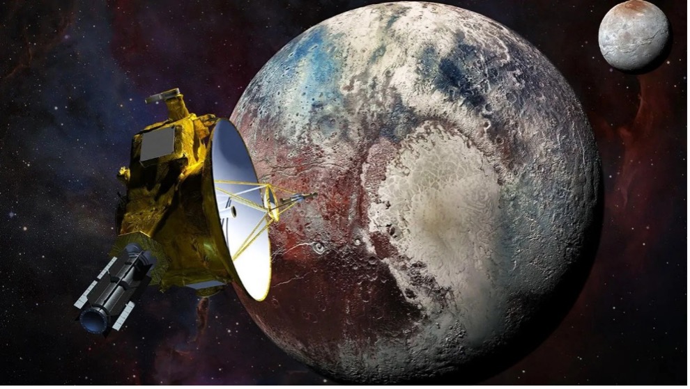 (R) New Horizons spacecraft superimposed over photo of Pluto |