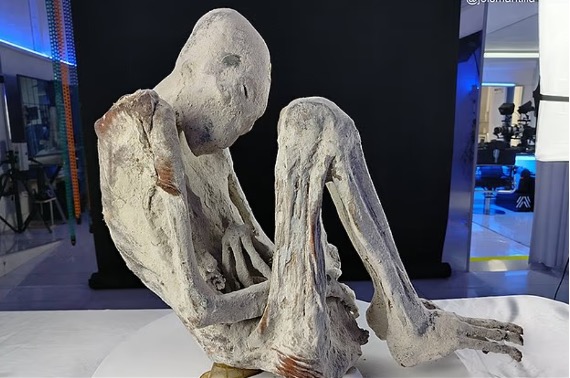 The above mummy is one of 21 found near the Nazca Lines in Peru in 2017. All had elongated heads and only three digits on each hand and foot. All were covered in white powder that may have been used to preserve them. But this mummy was unique because she was pregnant.