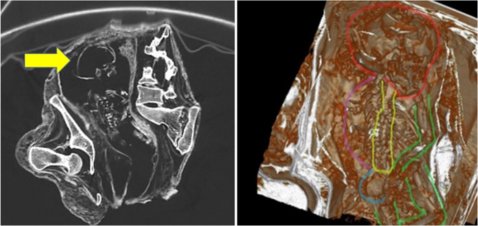 In the first image above, the yellow arrow points to the head of the fetus. The second photo shows the CT scan within a clear protective envelope. The red line drawn on the envelope delineates the fetus’ head and the yellow line its spine. The other lines are confusing but may mark the location of arms and legs.