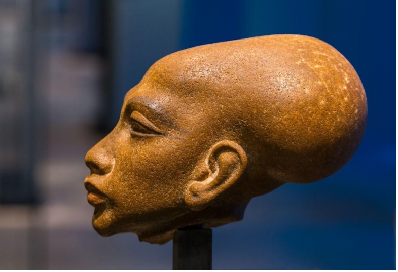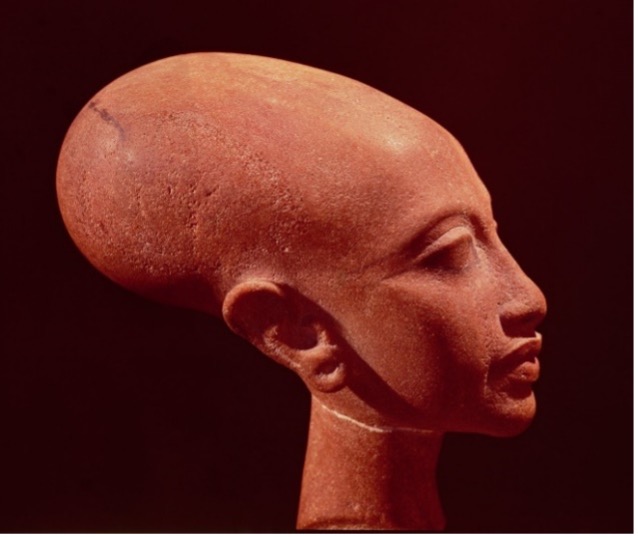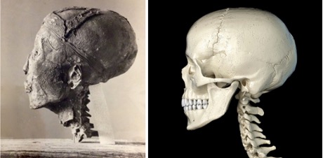This photo of the pregnant mummy’s head clearly shows a gold-colored implant in the middle of her forehead. |