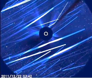 The photo on the left was taken on December 12, 2011 by the LASCO-3 camera onboard a NASA SOHO satellite that snaps a photo of the Sun every 12 minutes. It reveals unbelievable activity around the Sun. Compare it to a typical LASCO-3 satellite photo shown on the right.
