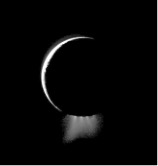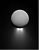Like the craft in the Voyager photo, the one flying away from Enceladus, though its shape is different, also is estimated to be about 2000 miles in diameter. Saturn’s rings can be seen on the right side of this photo. |