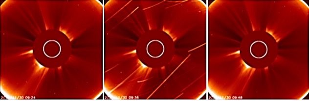 NASA’s SOHO LASCO-2 satellite camera snaps a photo of the Sun’s aurora every 12 minutes. It took these three photos at 9:24 . . . 9:36 . . . 9:48 on the morning of November 30, 2025. Notice all the activity around the Sun appears in only one of the sequential photos.
