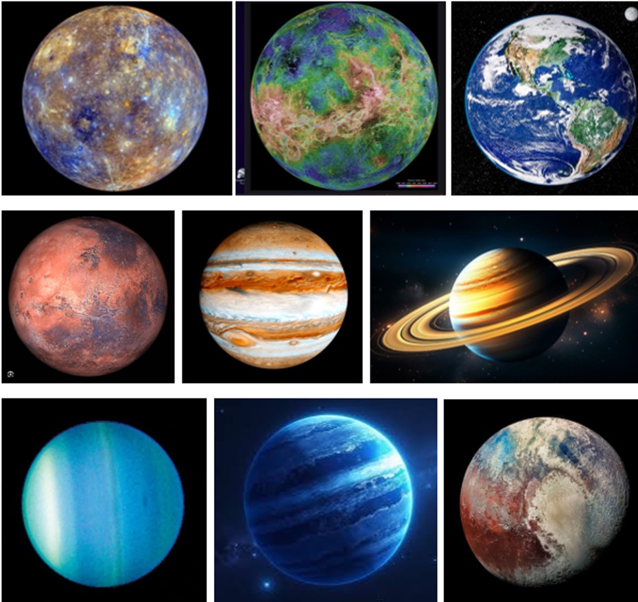 ● Mercury ● Venus ● Earth ● Mars ● Jupiter ● Saturn ● Uranus ● Neptune ● Pluto |