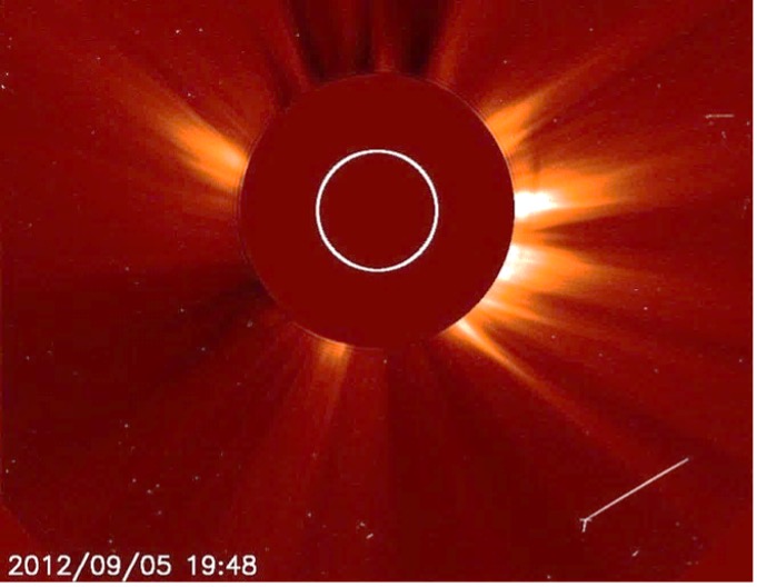 Here is one of his discoveries. The first is an original 2012 NASA SOHO satellite photo of the Sun’s aurora. Then he zeroed in on the “streak” in the lower right corner.