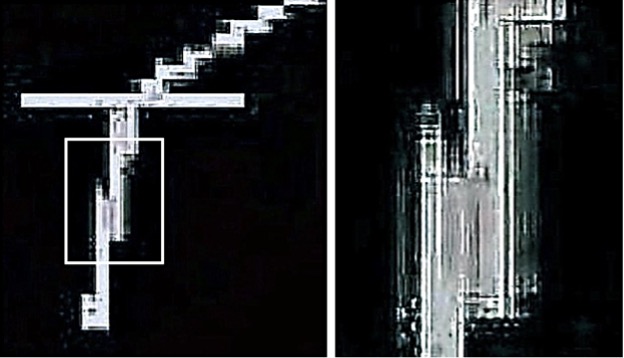 When he zoomed in even closer on the “T” shape, this is what he found. It proved to be a well-engineered metal structure which became more evident when he made enlargements of the section within the box in the first photo below.