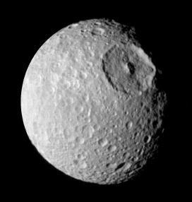 To add to the hexagon mystery, Saturn’s tiny moon Mimas (R) has a hexagon shaped crater. And, it’s even more puzzling that scientists have yet to find other hexagonal shapes on planets or moons in our solar system. |