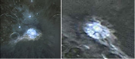 The Moon’s Aristarchus Crater is the brightest spot on the Moon. It sometimes glows red but mostly blue. Conventional scientists attribute the glow to high concentrations of a titanium-iron oxide and pyroclastic glass formed during ancient volcanic activity.