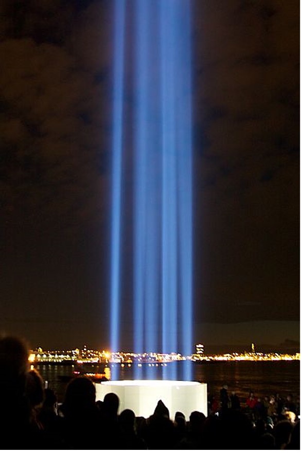 The memorial consists of 15 cloud-penetrating searchlights that beam straight up into the sky at least 2.5 miles. The white stone base has the words “Imagine Peace” carved into it in 24 languages.