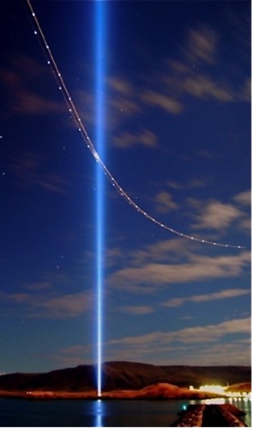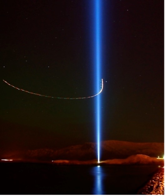 John Lennon’s birthday is October 9th. On that date in 2007, Yoko Ono dedicated a tower of light – Imagine Peace Tower – to her musician husband. Extraterrestrials took notice and a livestream EarthCam actually caught one UFO spiraling around the tower.