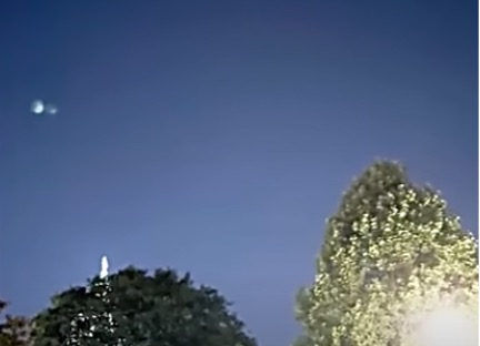 These video frames show two UFOs traveling intandem above the U.S. Capitol on September 8, 2025. The Capitol dome statue can be seen peeking above the darker green treetop.