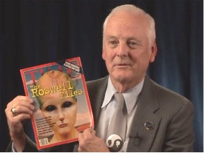 Don is shown with a Time magazine that was issued for the 50th anniversary of the Roswell crash.