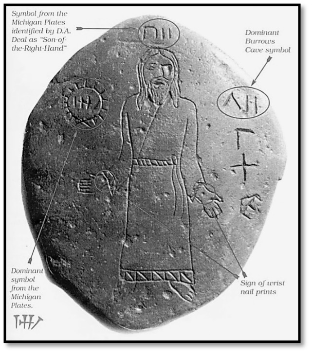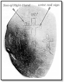 Three of the etched stones he found in the cave depicted the Crucifixion of Jesus. Two are shown above. A close look at the first stone shows the nail wounds are in Jesus’ wrists not the palms of his hands. It’s important to know that many ancient cultures included the wrist as part of the hand. Also, modern medical researchers have concluded that nails through the palms would not have supported the weight of a man on a crucifixion cross. |