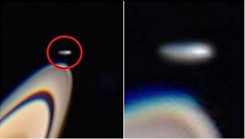 The above photo and its enlargement reveal a spacecraft flying near the edge of Saturn’s rings. It was taken by NASA’s Voyager 1 probe as it passed by the planet in 1980. Scientists estimate the craft was about 2000 miles in length.