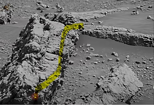 Most unique discoveries on the Moon are found on its backside where they cannot be seen from Earth. So, it’s surprising that a white pyramid with sharp edges is perched on a hilltop on the side of the Moon facing Earth. The yellow star marks its location.