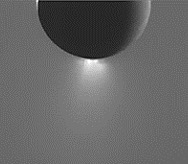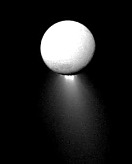 Like the craft in the Voyager photo, the one flying away from Enceladus, though its shape is different, also is estimated to be about 2000 miles in diameter. Saturn’s rings can be seen on the right side of this photo. |